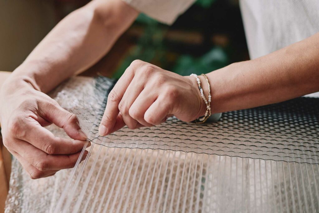 tissé main, fibre optique diffusante, cuivre émaillé et fibre optique