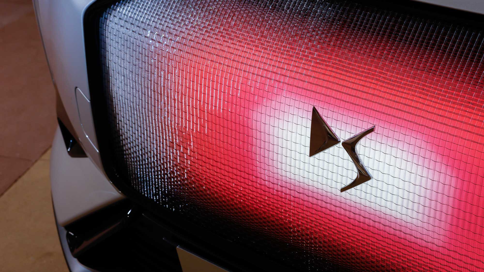 Premier prix du jury de l’appel à création DS & Métiers d’Art 2023, la calandre de la DS 3 E‑TENSE Incidence est une épreuve technique et esthétique. Les principes de transparence, de profondeur et de vibration ont inspiré ce tissage à mémoire de forme. Un rétroéclairage révèle un dégradé aux teintes pourpre et met en valeur le logo de la marque.